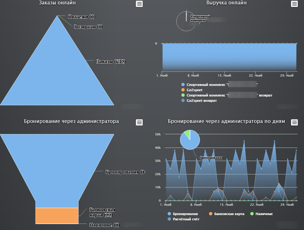 • Отчеты по группам, персональным занятиям, детским тренировкам;