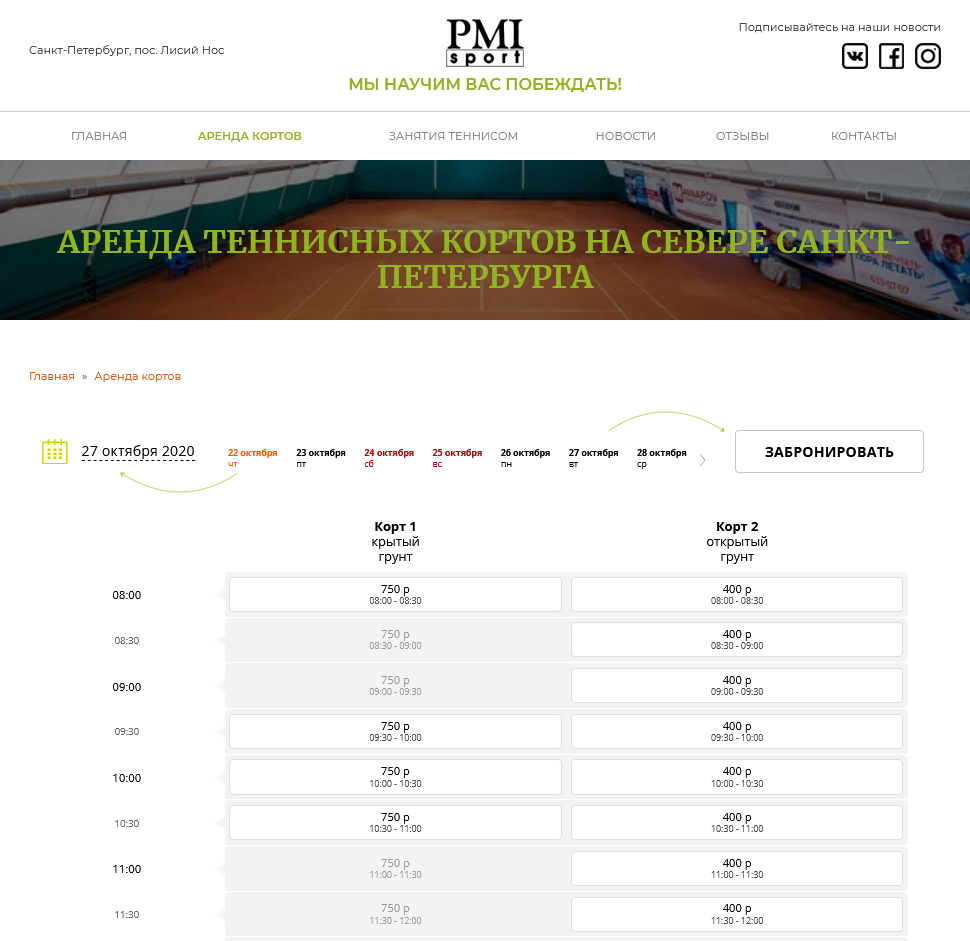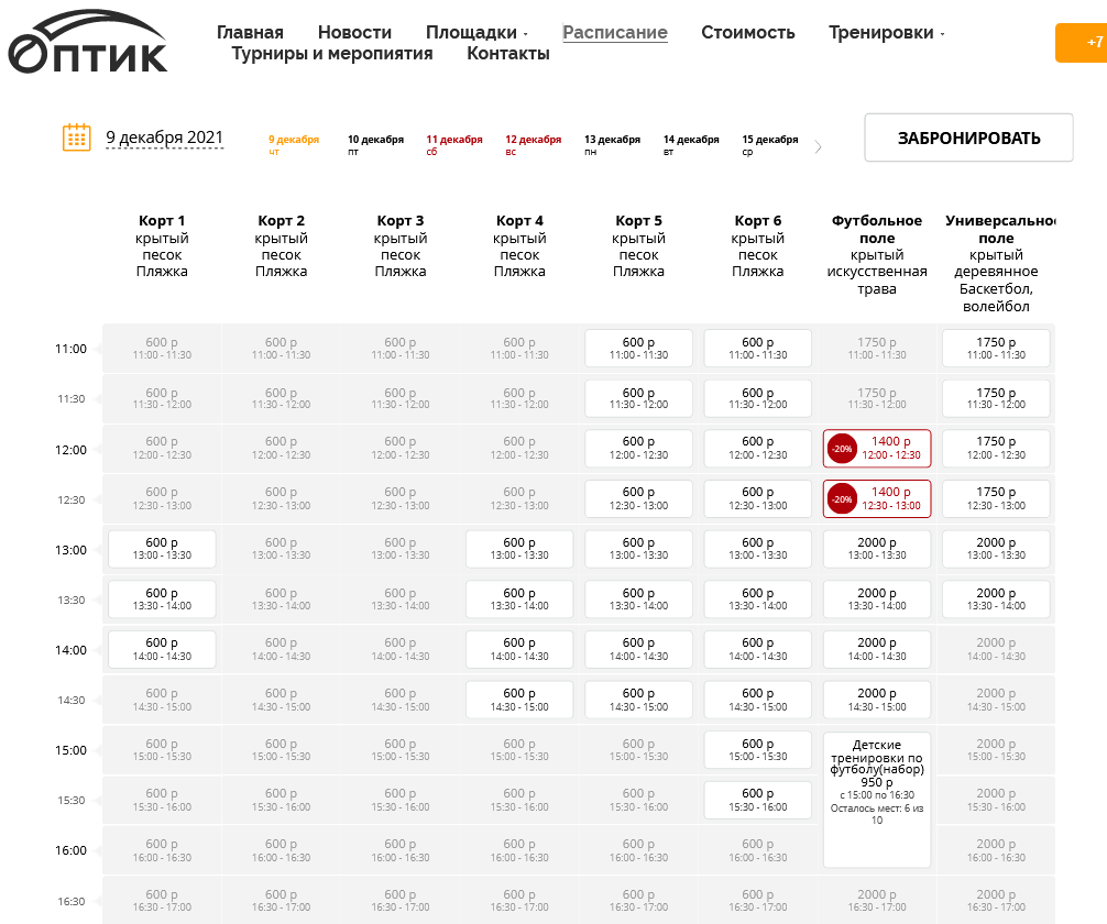Пример страницы клуба с сеткой бронирования на портале Go2Sport:
